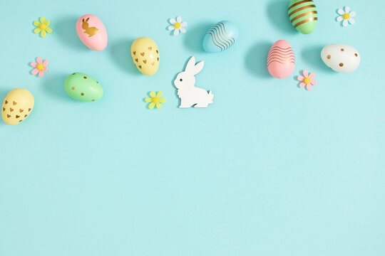 Easter holiday composition. Easter eggs, wooden bunny toy,decorations on isolated pastel blue background. Easter concept. Flat lay, top view, copy space