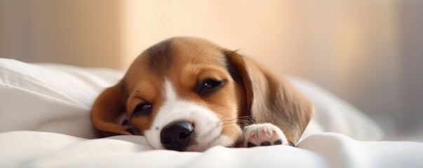 A sleepy young nice cute puppy dozing on a white pillow, panorama. Generative Ai