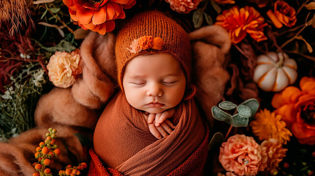 Adorable sleeping newborn photoshoot in cozy blanket surrounded by fall flowers and pumpkin. Cozy autumn-themed newborn portrait with floral background. Seasonal newborn photoshoot.
