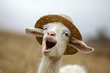 A lively goat wearing a straw hat, expressing joy and surprise with wide-open eyes and mouth.