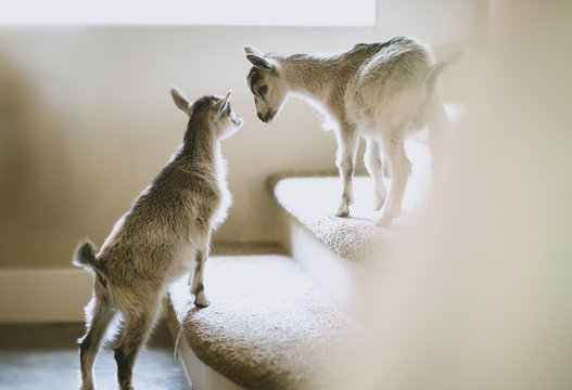 Adorable white goat in a rustic barn illuminated by sunlight, creating a charming farm scene