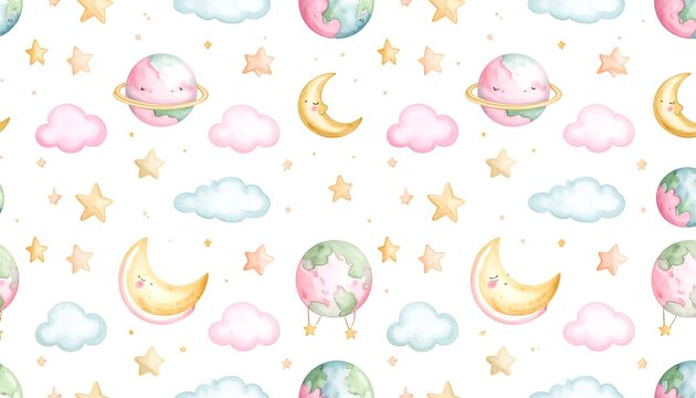 Seamless pattern of cute cartoon clouds, moons, stars, and rain image photo