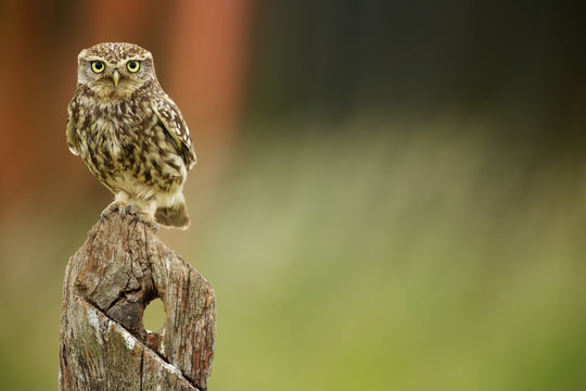 A close up picture of a cute little elf owl with adorable big googly eyes and white and brown features is standing on a box ready to be pet.