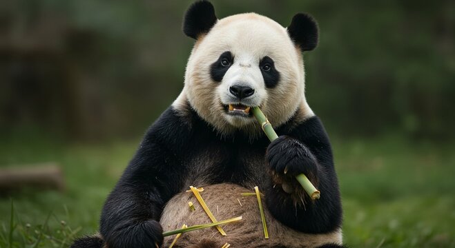 Adorable young panda bear enjoying a delicious bamboo snack in a lush green habitat