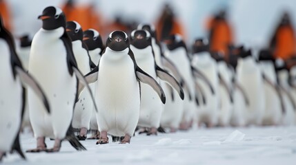 An engaging image of a large group of penguins walking in a line on the snowy ground, displaying a sense of coordination and the harsh yet beautiful polar environment.