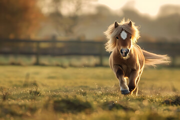 Shetland pony moving swiftly in a field