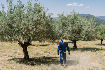 Male worker in protective helmet and uniform mowing grass with brush cutter on sunny day on background of amazing landscape