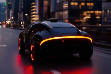 Cutting edge self driving electric vehicle with glowing red lights cruises through urban streets at night, showcasing futuristic technology
