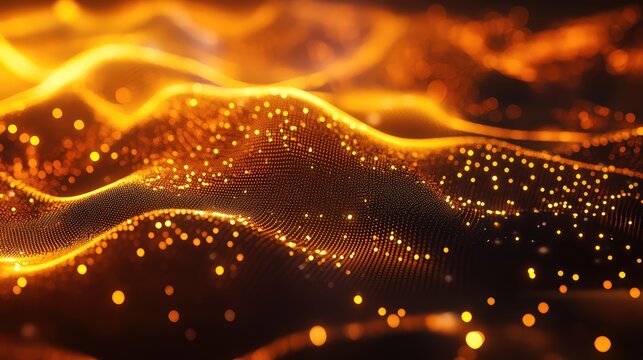 Abstract network of glowing orange particles creating a fluid digital wave, visualizing data flow, artificial intelligence, and cutting edge technology concepts