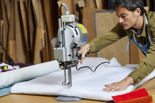 Worker Using Fabric Cutting Machinery In Sofa Workshop