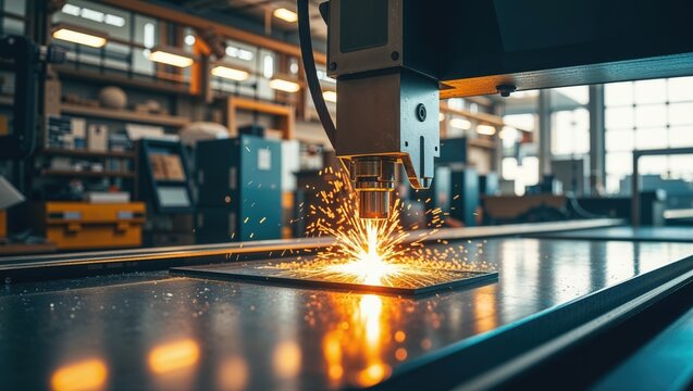 Precision laser cutting process illuminates a metal sheet in a busy workshop during daylight hours