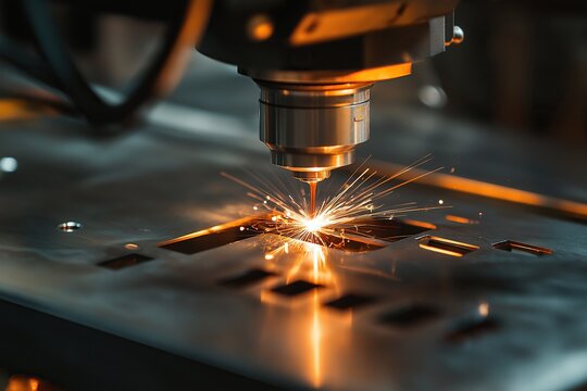 A precision laser cutter being used in a workshop, clean industrial space with high-powered laser beams and metal sheets, High-tech style