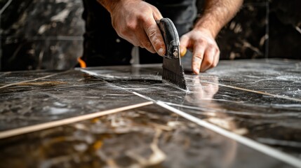 Tiler cutting tiles to fit a bathroom floor. Featuring precision and technique