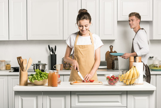 girlfriend cooking salad and cutting tomatoes in kitchen