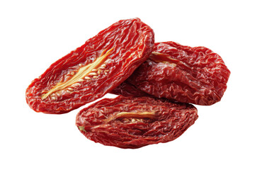 Close-up of three sun-dried tomatoes against a black background, cut out