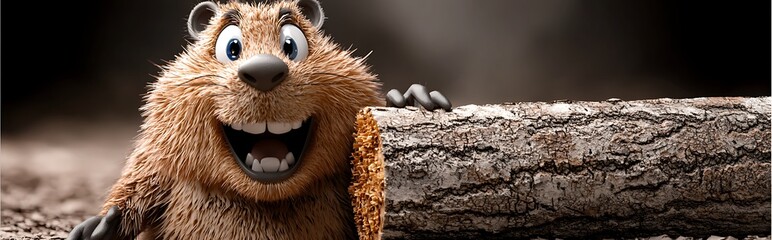 Playful cartoon rodent smiling beside a freshly cut log in a whimsical forest setting