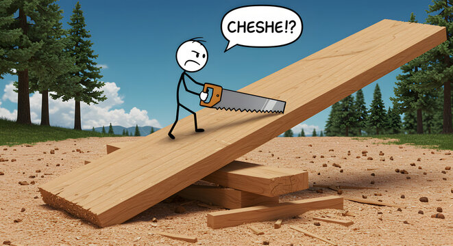 Angry stick figure struggling to saw a large wooden plank outdoors with a handsaw, expressing frustration in a cartoon style