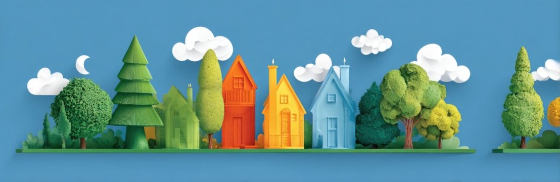 A colorful papercut illustration of a stylized neighborhood with houses, trees, clouds, and moon