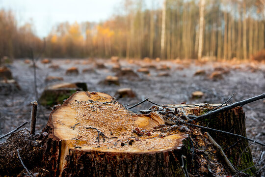 Cut down trees in the forest. A huge stump  and felled trees in the background.