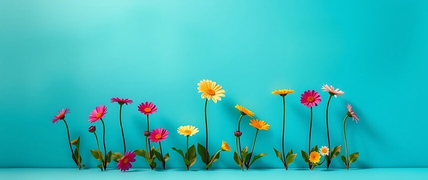 Vibrant gerbera daisies arranged in a colorful arc against a teal background