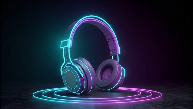 Neon outlined headphones with purple and cyan glow on dark background audio music