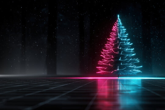 Neon wireframe portal cube emitting cyan magenta glow futuristic grid hologram tech branding