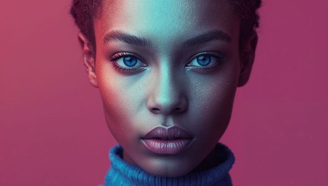 Closeup young model holding gaze with dewy skin, cyan rim lighting on pink background
