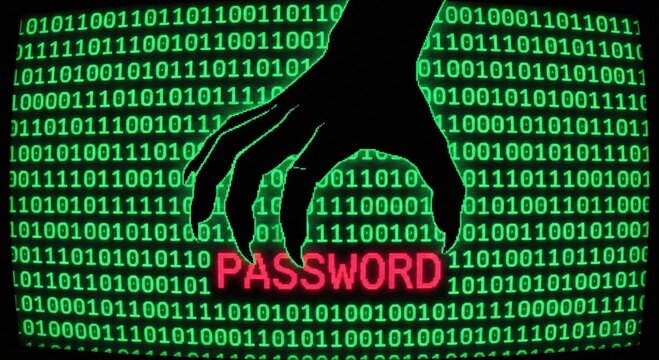 Digital Security Threat Concept with Hand Reaching for Password on Screen Displaying Binary Code Background
