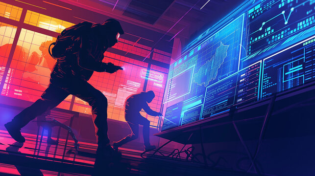 a dynamic scene showing a cyber attacker attempting to breach a network while cybersecurity professionals respond with countermeasures for digital data protection