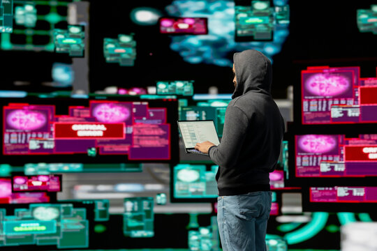 Hackers wear hoods to cover their faces. Hacking to steal important information. Use a computer to release malware viruses Ransom and harass organizations. He sitting in the dark room with neon light