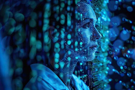 Digital representation of AI consciousness in cyberspace. Futuristic human profile head appears as glowing dots. AI head glows in dark blue background. Virtual network concept. Modern tech,