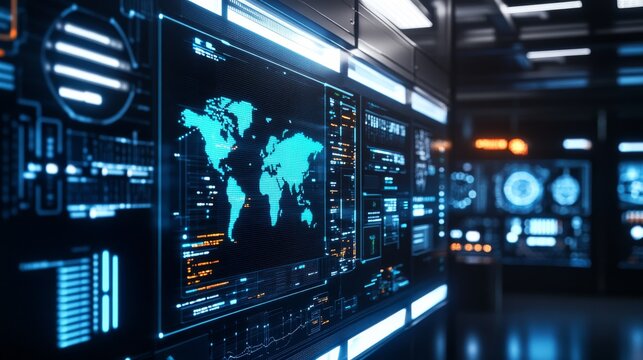 An AI powered cyber defense system monitoring global threats in a high tech security operations center, glowing digital firewall interface, real-time threat analysis dashboard