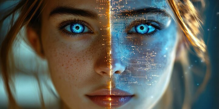 Half human brain and half digital circuit brain symbolizing the fusion of biology and artificial intelligence.
