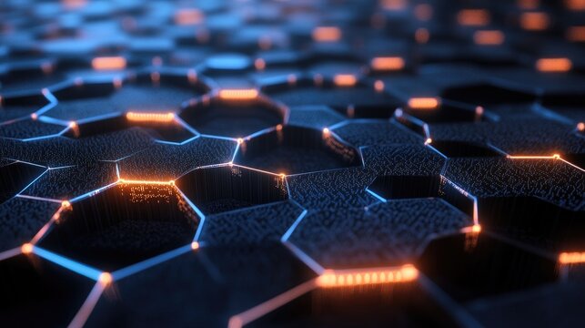 High-tech 3D background with hexagonal grid and digital data streams, advanced design