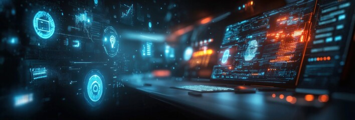 Futuristic Digital Workspace with Holographic Icons for Business Planning and AI Learning