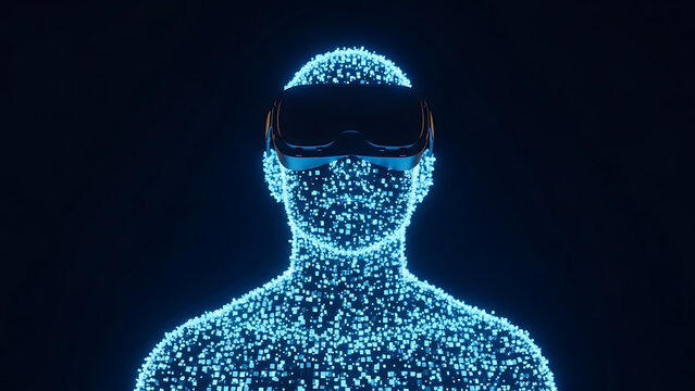 Digital human avatar made of glowing blue particle blocks wearing virtual reality headset against deep black background representing metaverse immersion or simulation