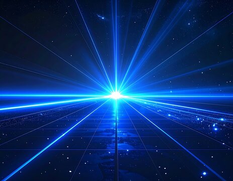 Vibrant neon blue laser lines streak across a black background, creating dynamic light beams. The abstract digital scene symbolizes technology, speed, energy, and the futuristic pulse of modern innova