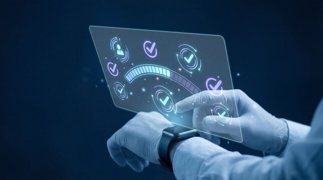 Human hand holding glowing digital gauge with value indicator, representing measurement, innovation, and futuristic technology