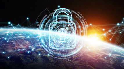 Digital cybersecurity abstract with globe and fingerprint lock