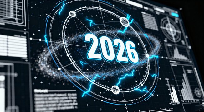 The year 2026 displayed in a glowing digital interface (HUD), surrounded by electric blue arcs and complex futuristic data graphics on a dark screen.