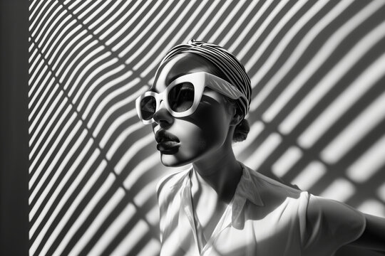 An artistic grayscale image of a woman wearing sunglasses covered by striped shadows