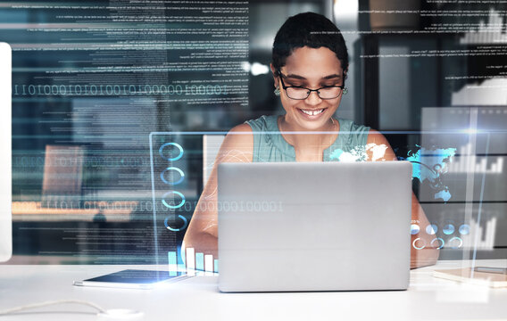 Laptop, hologram hud or business woman review finance chart, stock market database or futuristic night overlay. Forex investment, online data analysis or African trader trading NFT, bitcoin or crypto