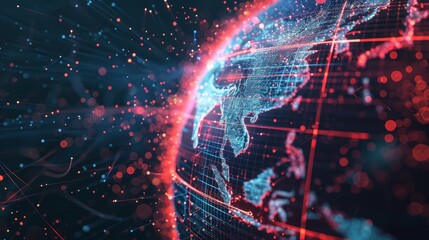 Abstract glowing digital world map with connection points. Dark background with red highlights representing global network connections.