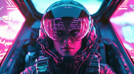 Sci-fi pilot wearing high-tech helmet inside neon cockpit with digital controls.