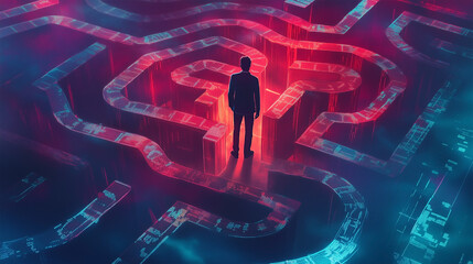 Digital Journey Through a Complex Maze of Obstacles Representing Cybersecurity Challenges and Firewall Barriers in the Modern Tech Landscape