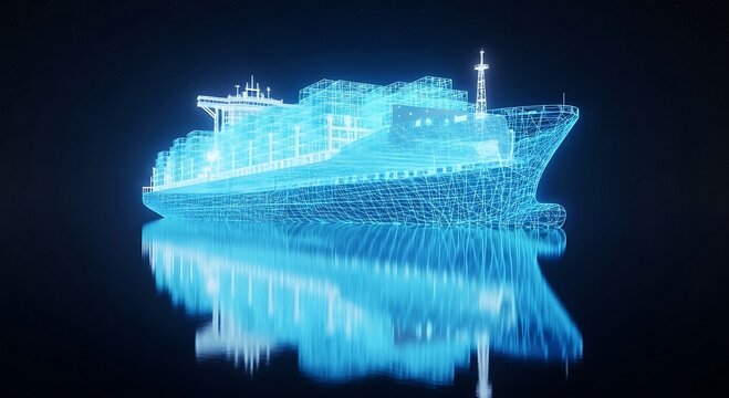 Futuristic Blue Holographic Cruise Ship Projection on Black Background.