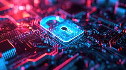 Photo of digital security lock icon on a circuit board background with glowing blue lights, representing cyber protection and data safety