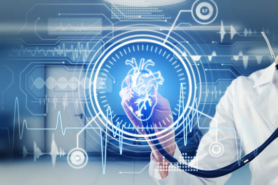 Female doctor pointing at abstract glowing cardiovascular medical hud screen on blurry hospital interior background. Online medicine, cardiology and health concept. Double exposure.