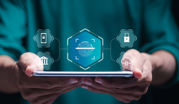 Digital banking. Cybersecurity. Data protection. Close-up of a man scanning his fingerprint for biometric identity and approval. Future security concept, password control through fingerprints.