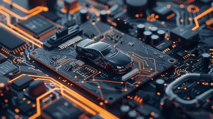 A luminous, high-tech holographic model of a car displays intricate inner workings of the engine and components, set against a digital background.